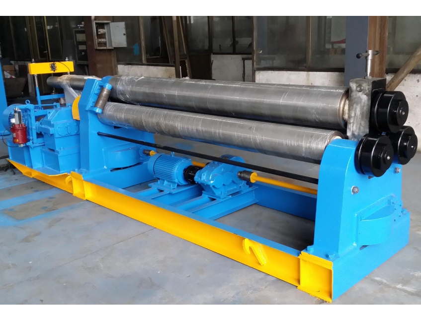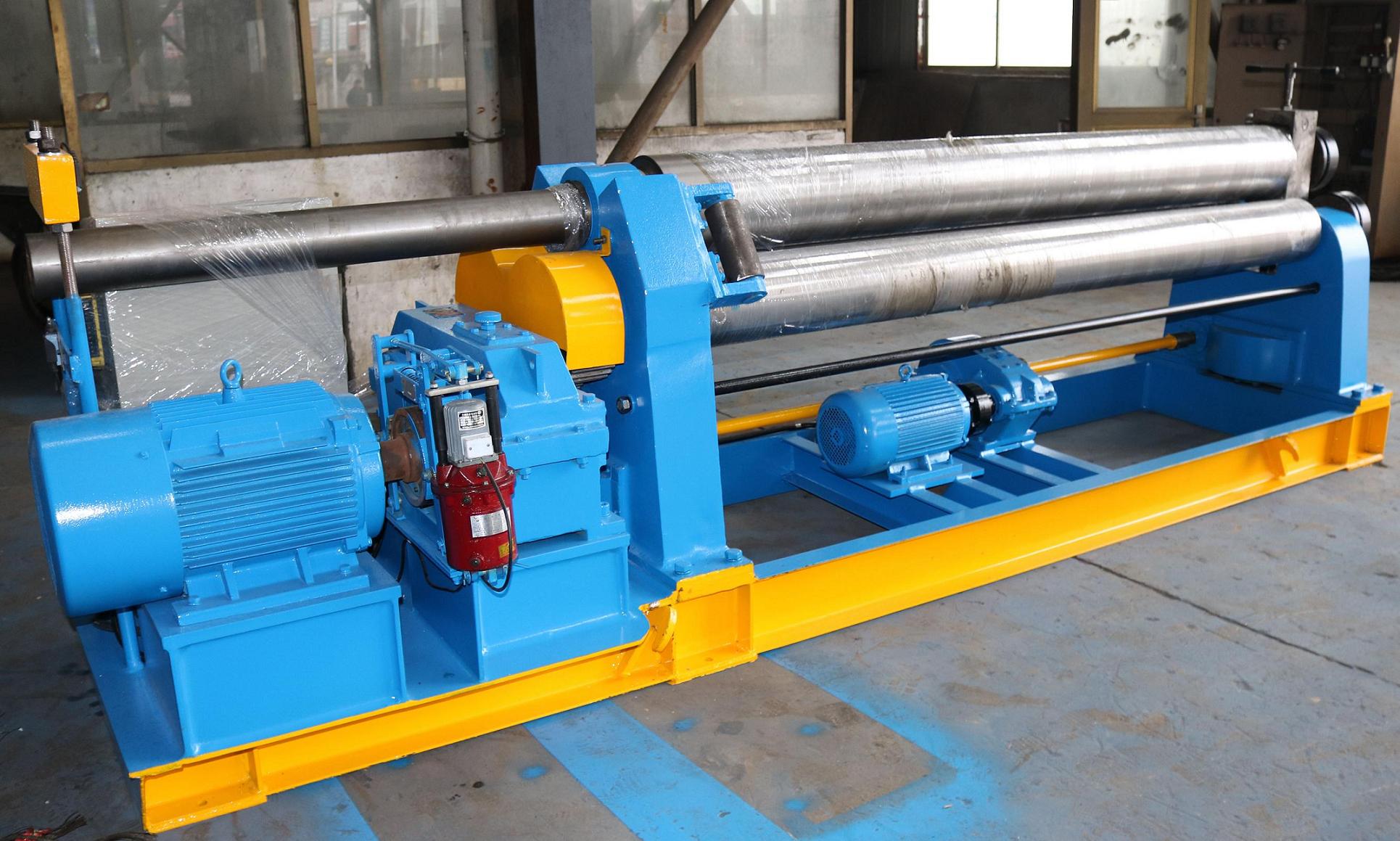 W11对称卷板机是全机械对称式三辊卷板机。 三个滚筒全部固定,像金字塔一样放置。