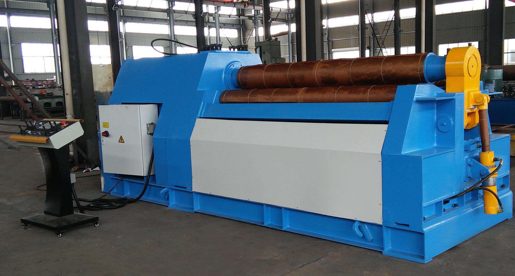 T4-10T3000W Plate Bending Machine is a type of double pinch plate bending machine. Each of the rollers is separate driven. Rollers rectilinear slide ways coated with antifriction material, no maintenance, suit to heavy duty loading, smooth and stable positioning. Spherical roller bearings are equipped on the rollers. All of the rollers in alloyed steel are induction hardening and heat treatment. All of the rollers will be grinded and polished after induction hardening treatment.